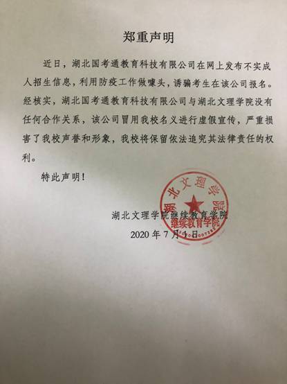 近日,湖北国考通教育科技有限公司在网上发布不实成人招生信息,利用防疫工作做噱头,诱骗考生在该公司报名。经核实,湖北国考通教育科技有限公司与350vip8888新葡的京集团没有任何合作关系,该公司冒用我校名义进行虚假宣传,严重损害了我校声誉和形象,我校将保留依法追究其法律责任的权利。