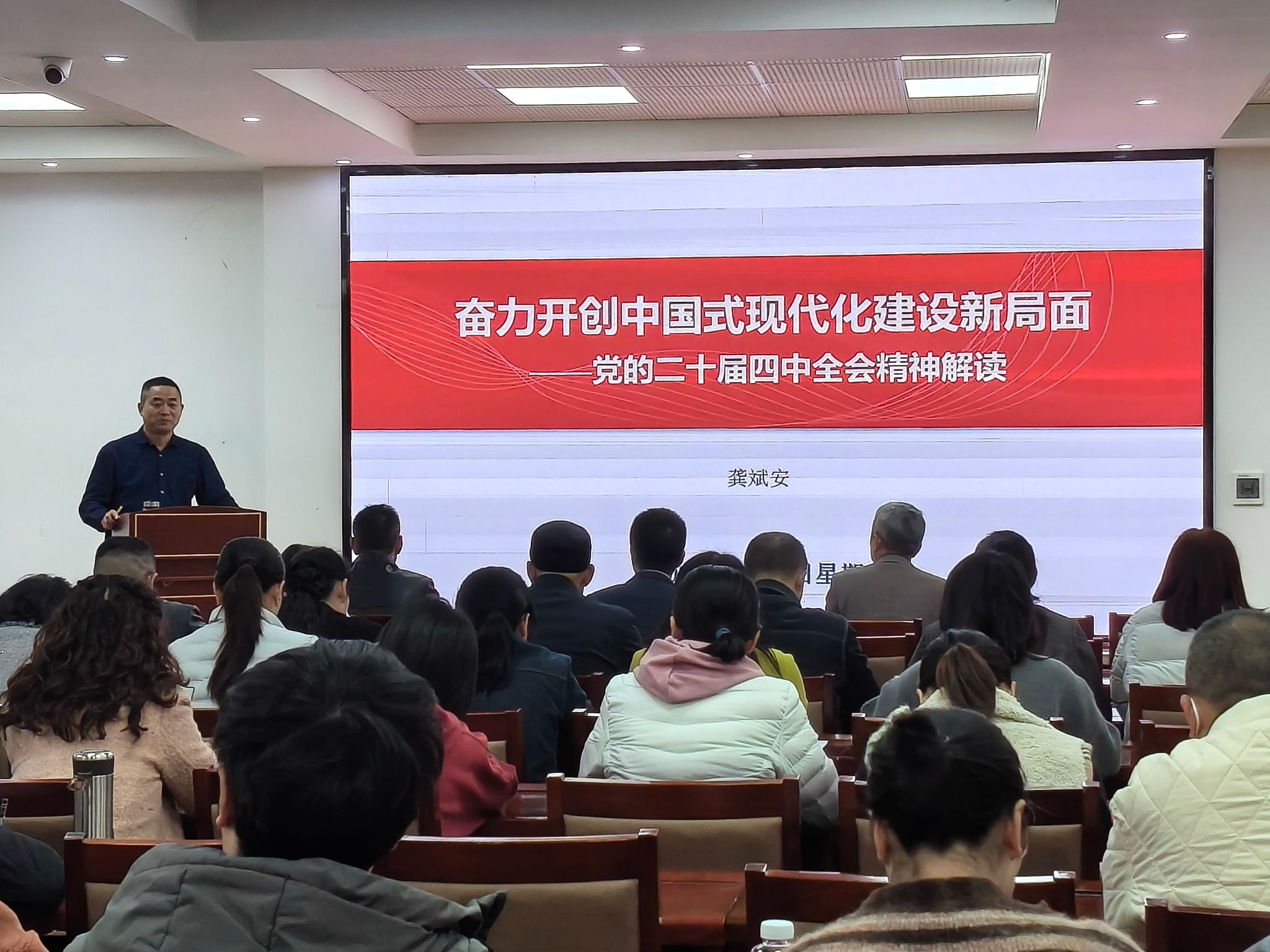 讲座中,龚斌安以“奋力开创中国式现代化建设新局面”为主题,从“十五五”时期在基本实现社会主义现代化进程中的历史方位,“十五五”时期经济社会发展的指导思想、重大原则、主要目标,“十五五”时期经济社会发展的战略任务和重大举措及坚持及加强党的全面领导,凝聚起推进中国式现代化的磅礴力量等四个维度系统解读了党的二十届四中全会精神的核心要义,以通俗易懂的语言,结合中外发展对比案例,阐释了“十五五”时期在全面建设社会主义现代化国家中的承前启后作用,帮助教职工厘清从“十四五”到“十五五”的阶段性特征,同时他还特别指出,建筑学院需在“十五五”期间主动融入国家战略,以科技创新赋能绿色低碳转型,助力实现“人居环境品质跃升”目标。