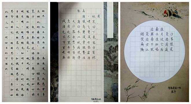 本次比赛规定参赛选手可以从比赛例题中任选一首古诗进行描摹,字体不限,也可自行选题,共设一等奖3名,二等奖5名,三等奖8名。比赛现场参赛学生执笔凝神,认真构思,落笔回寰之间呈现出一幅幅或俊雅或娟秀、或苍劲有力、或隽秀飘逸、或端正整洁的作品。