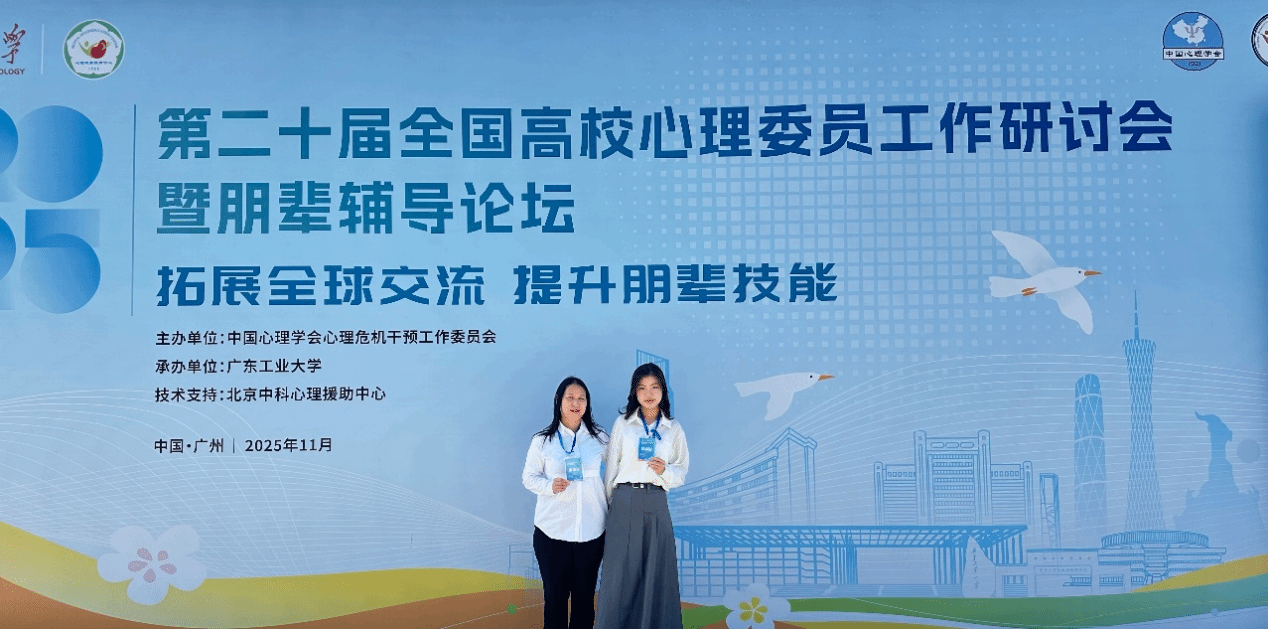 近日,第二十届全国高校心理委员工作研讨会暨朋辈辅导论坛在广东工业大学圆满落幕。大会围绕“拓展全球交流,提升朋辈技能”的主题,展开了深入的交流与探讨,共同致力于推动高校心理育人及朋辈辅导工作的高质量发展。beat365平台官方网站心理专干张华容老师和学生心理委员代表杨可有幸参加了此次盛会,杨可同学凭借其出色的工作表现和卓越的心理健康教育工作能力,入选“全国百名心理委员风采展”。