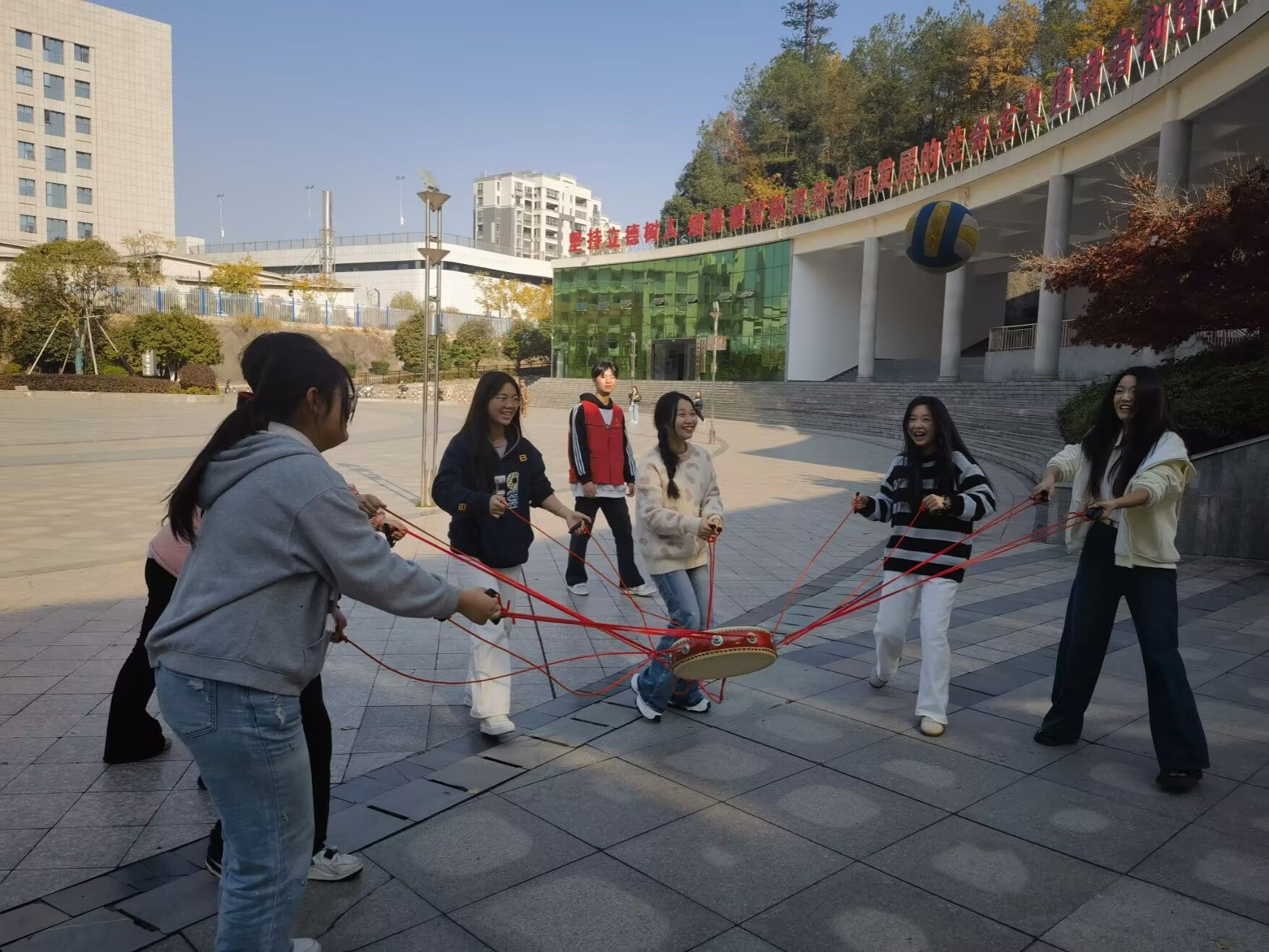 在“同心击鼓”项目场地,一幅充满活力的画面徐徐展开。参与者们有序地围站成一个紧密的圆圈,每个人的手中都紧紧牵拉着一根连接着同心鼓的绳索。他们的目光如同聚焦的光线,紧紧锁住空中那枚跳跃的排球。随着排球的起落,大家齐心协力地调整着鼓面的倾斜度,试图让排球在鼓面上稳定地弹跳。每一次成功的击球,都伴随着一阵欢呼声,那声音在广场上空回荡,仿佛是对团队协作的赞歌。这个游戏就像一个生动的课堂,让每一位参与者深刻领悟到团队合作的真谛:在这个集体中,每个人都是一块拼图,少了任何一块,都无法拼凑出完整而完美的画面;只有大家紧密相连,心往一处想,劲往一处使,才能奏响和谐的乐章,达到最佳的效果。