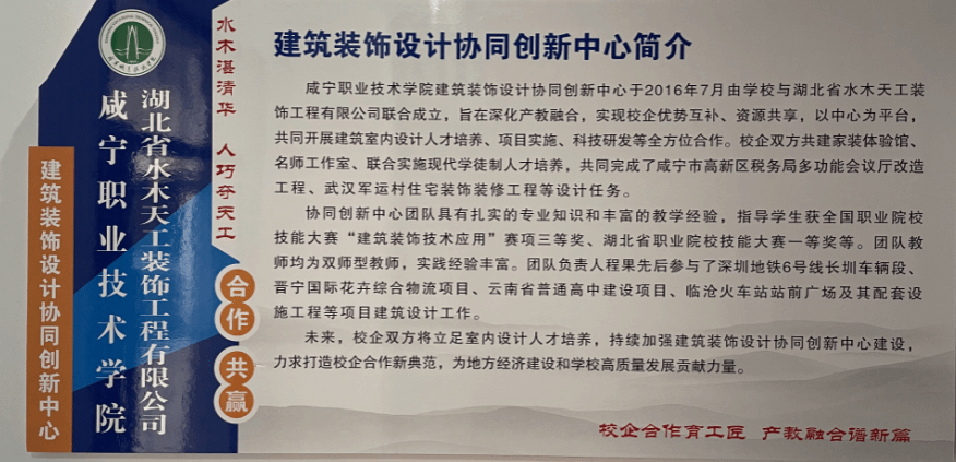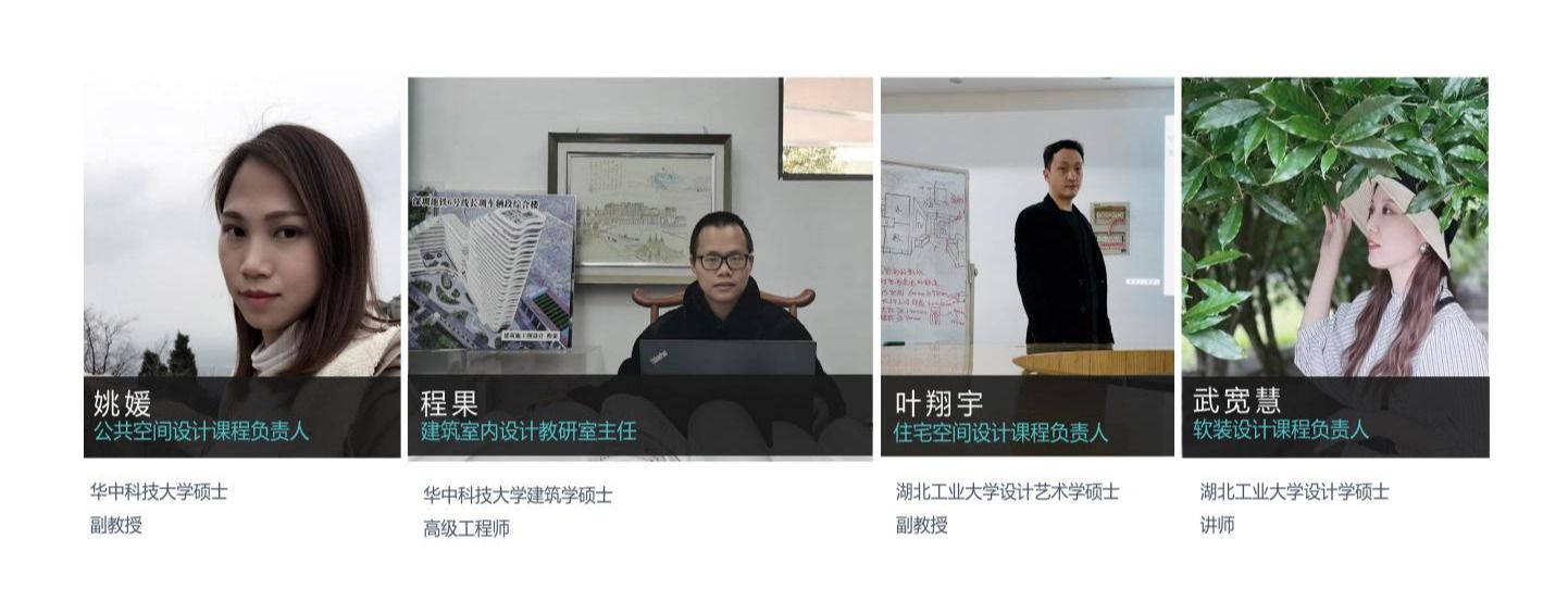 师资团队:建筑室内设计专业共有专任教师6名,副教授3人,硕士及以上学历占100%,双师比例100%,所有教师均有企业从业经验。专业带头人程果毕业于华中科技大学建筑学专业,曾获中国中铁股份有限公司优秀工程设计二等奖、湖北省职业院校技能大赛建筑装饰数字化施工赛项(高职组)教师赛一等奖。